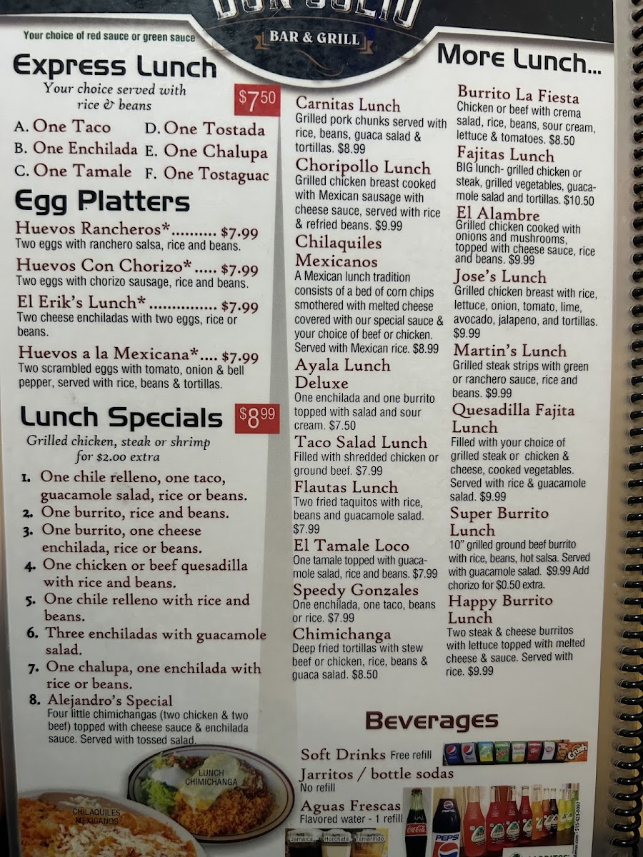 Two plate dinner. One enchilada, one burrito, one chile relleno, one chalupa, one taco, rice and beans. This meal is big, just as the flavor! Try it!